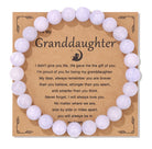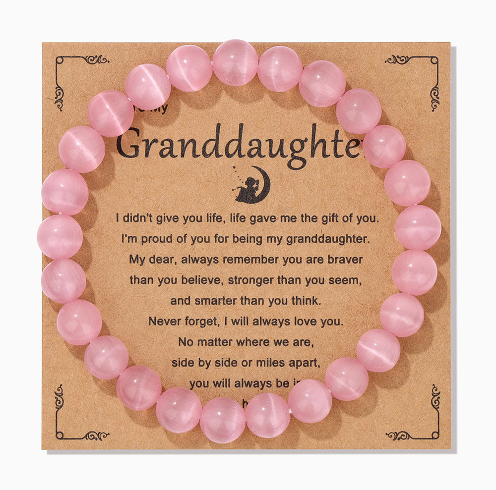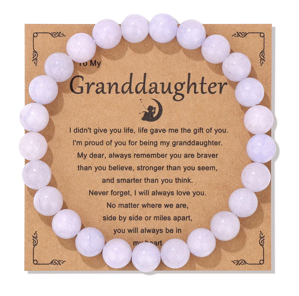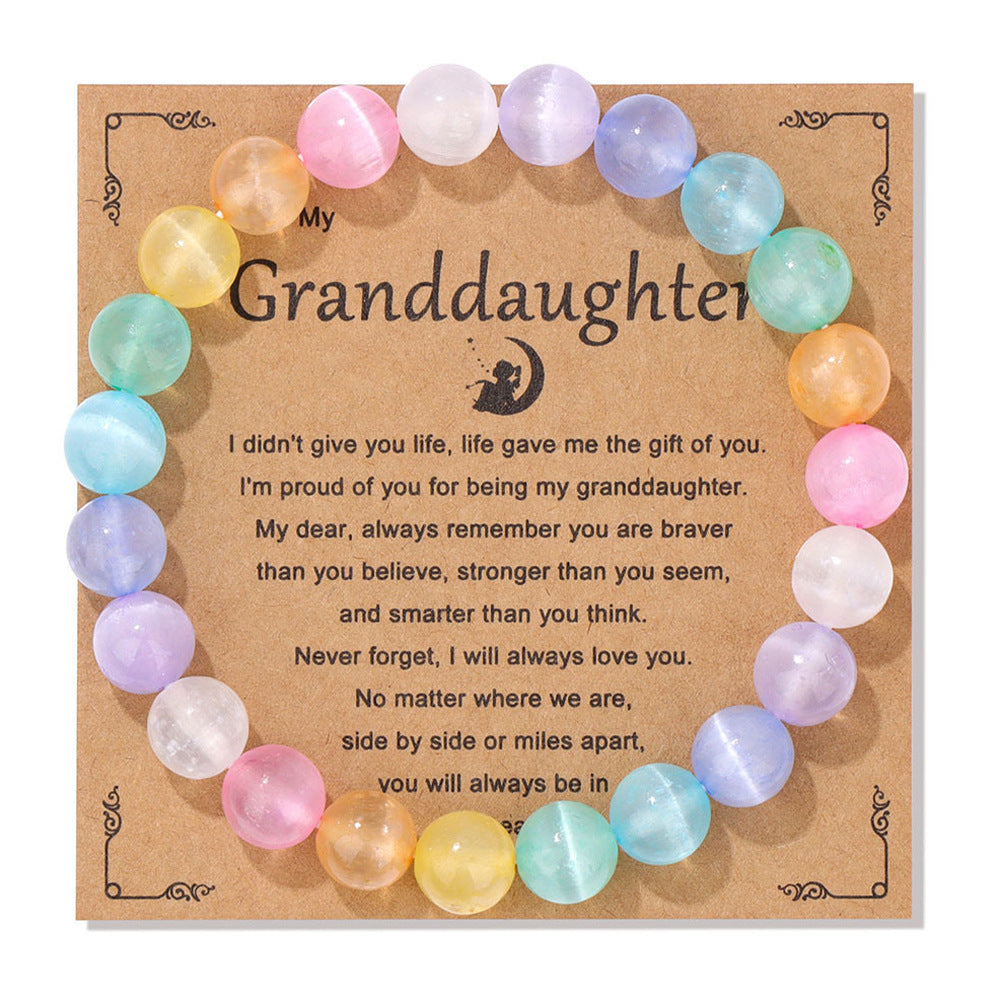 Check out the TO MY GRANDDAUGHTER bracelet — proper hand-made with mixed stones and geometric beads, comfy as and easy to chuck on thanks to the stretchy cord.